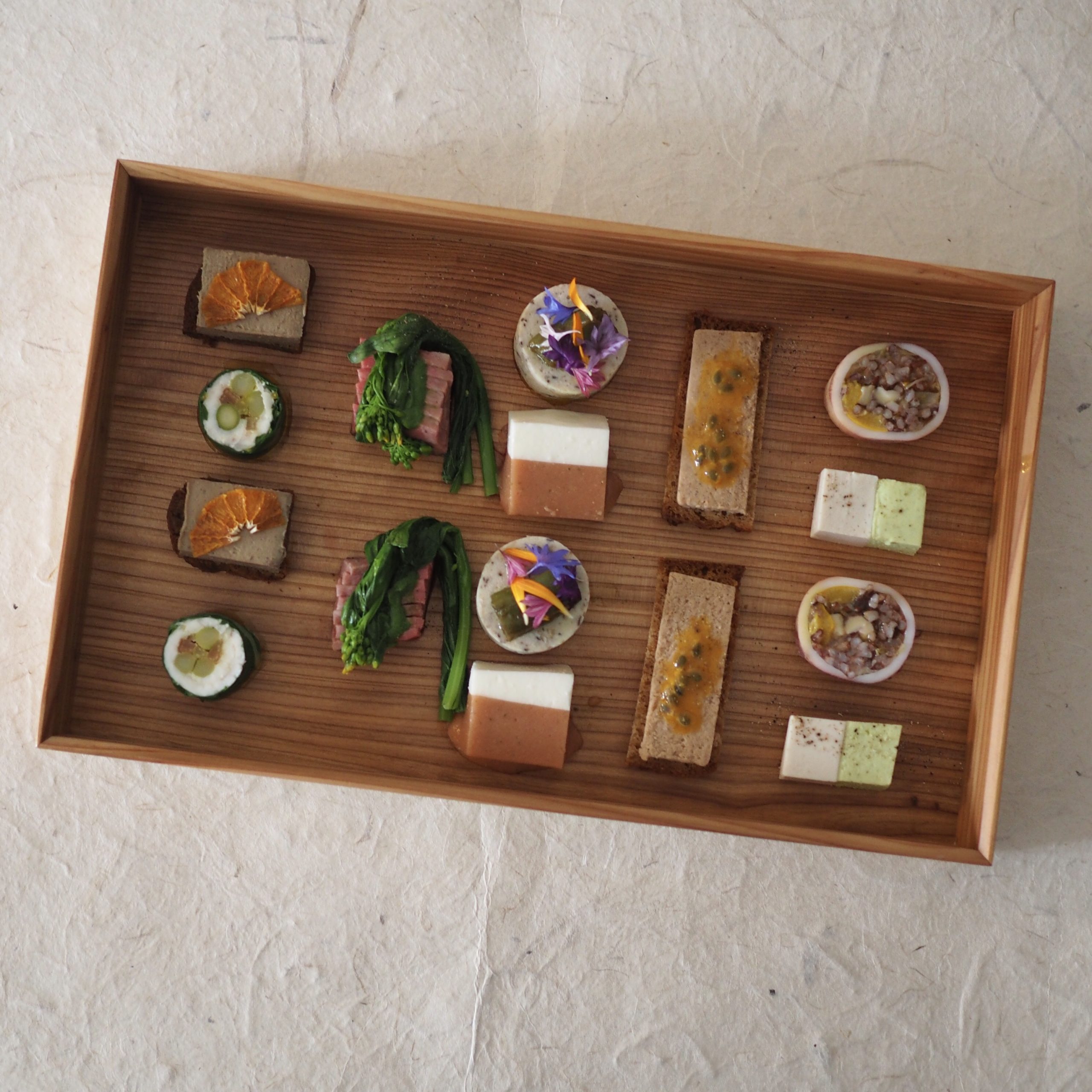 ORDER NUMBER 45 2020.5.10 sugi-hors-d-oeuvre 白子とグリーンピースのテリーヌ 雑魚のブランダードとパンデピス 豚肉のリエット パッションフルーツのソ...