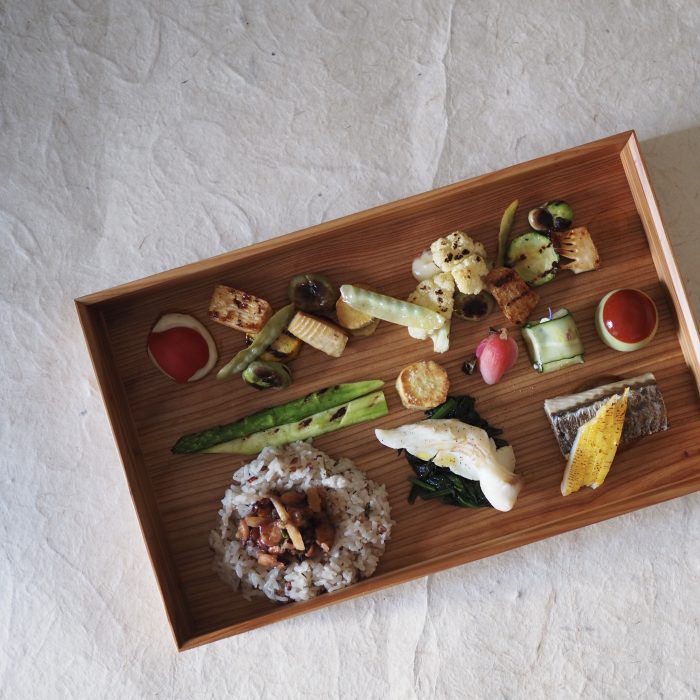 ある日の杉箱弁当 ORDER NUMBER 26 2020.5.1 sugi-bento 鰆のロースト 平目のブレゼ 水イカの味噌漬け フルーツトマトの白和え グリーンピースと赤ピーマンのボンボン ラディッシュのピクルス ブリの白子のテリーヌ 焼き野菜 空豆 赤玉ねぎ ズッキーニ アスパラ カリフラワー 絹さや さつまいも 自然薯 赤米の茶飯 真蛸と春牛蒡のソース
